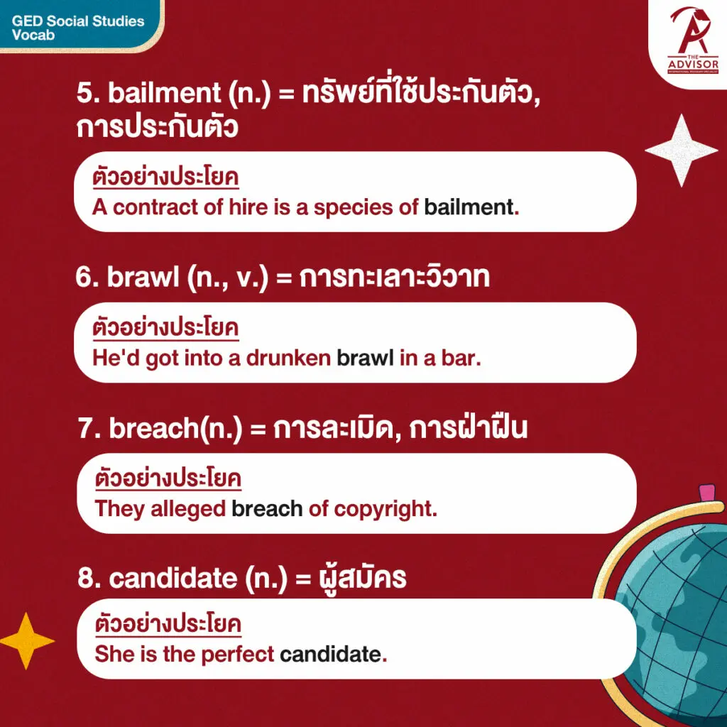 แต่ไม่ต้องกังวลไปนะคะ เพราะใน Blog นี้ พี่ได้คัดสรรและรวบรวม 40 คำศัพท์ ที่เจอในข้อสอบ GED วิชา Social Studies บ่อย ๆ มาให้แล้วค่ะ น้อง ๆ คนไหนที่มีแพลนจะไปสอบ GED จดโน๊ตไว้ได้เลยค่า