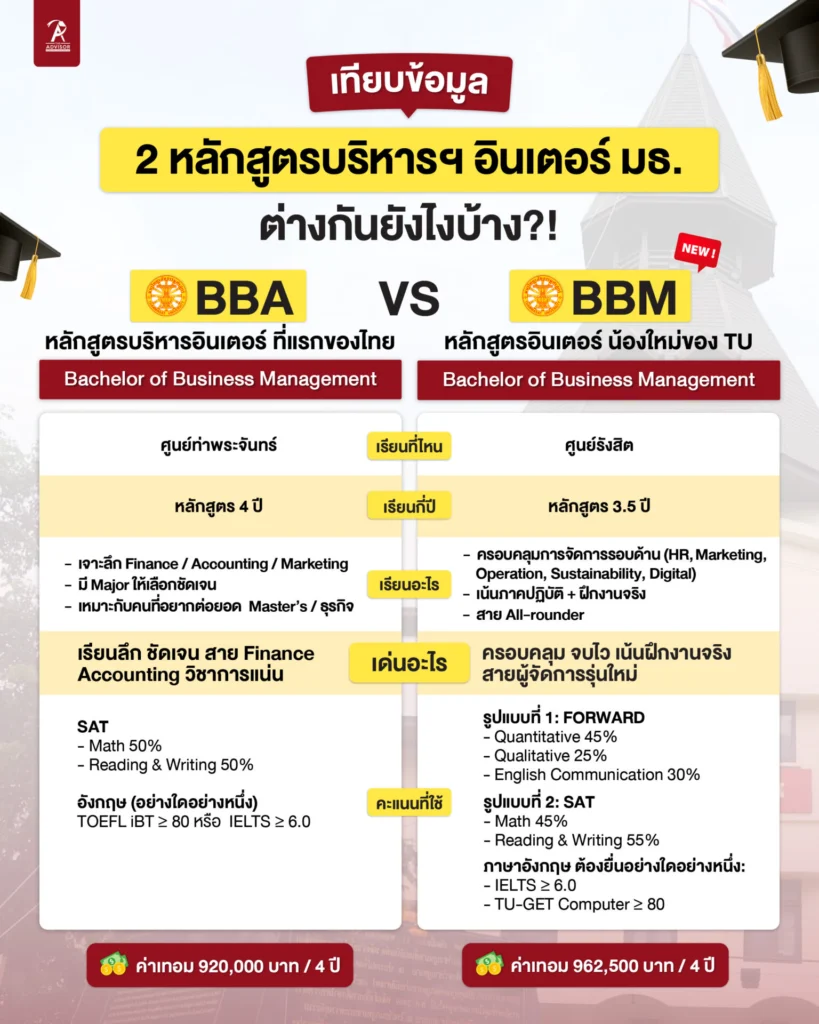 เป็นหลักสูตรอินเตอร์น้องใหม่ล่าสุดของ Thammasat Business School ที่เตรียมเปิดรับนักศึกษารุ่นแรกใน TCAS 69 ระยะเวลาการเรียนเพียง 3 ปีครึ่ง โดยมีการฝึกงานจริงในองค์กรใหญ่เป็นเวลา 4 เดือน จุดเด่นของ BBM TU คือการเรียนที่ครอบคลุมทักษะการจัดการธุรกิจรอบด้าน ไม่ว่าจะเป็นการตลาด การเงิน การจัดการทรัพยากรมนุษย์ กลยุทธ์องค์กร ความยั่งยืน รวมถึงธุรกิจดิจิทัล หลักสูตรนี้มุ่งเน้นการเรียนรู้เชิงปฏิบัติและ Project-based Learning ทำให้นักศึกษาได้ฝึกประสบการณ์จริงตั้งแต่ในรั้วมหาวิทยาลัย เหมาะกับน้อง ๆ ที่อยากจบไวและพร้อมเข้าสู่ตลาดแรงงานในทันที โดยมีเป้าหมายให้บัณฑิตก้าวสู่ตำแหน่งผู้จัดการหรือผู้บริหารในอนาคตค่ะ