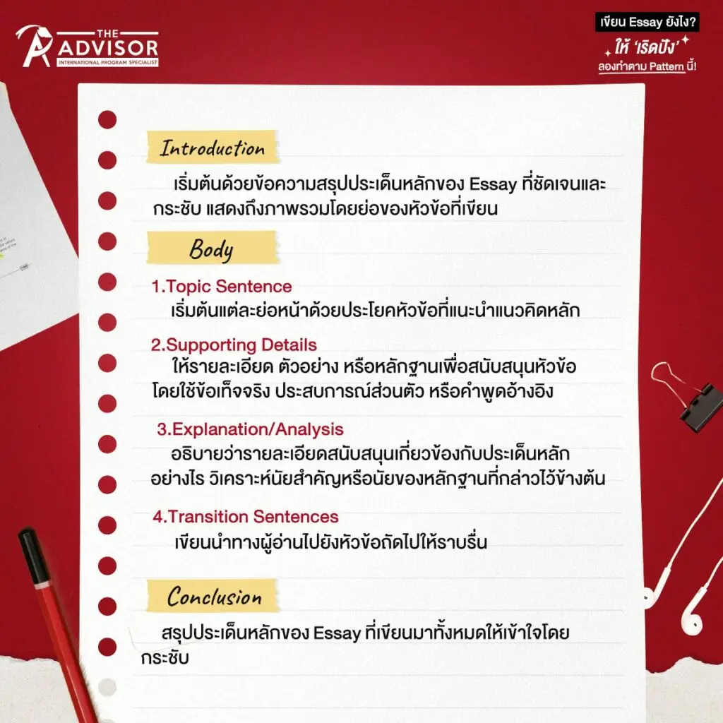 โครงสร้างของการเขียน Essay ที่เหมาะสมควรมี 3 ส่วน ซึ่งประกอบไปด้วยบทนำ (Introduction) ส่วนเนื้อหา (Body) และบทสรุป (Conclusion) พี่จะค่อย ๆ อธิบายในแต่ละส่วนดังนี้นะคะ