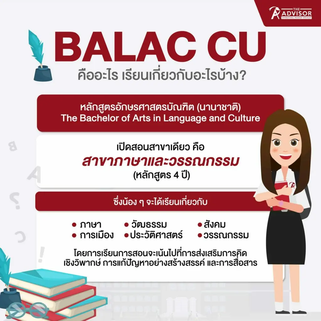 หลักสูตร BALAC ของคณะอักษรศาสตร์ จุฬาลงกรณ์มหาวิทยาลัย เป็นหนึ่งในหลักสูตรนานาชาติที่ได้รับความนิยมมากที่สุดในประเทศไทย เนื่องจากเป็นหลักสูตรที่ผสมผสานระหว่าง “ภาษา” และ “วัฒนธรรม” เข้ากับแนวคิดด้าน “สื่อสารและความเข้าใจระหว่างวัฒนธรรม” อย่างลึกซึ้ง เหมาะสำหรับผู้ที่ต้องการพัฒนาทักษะการคิดวิเคราะห์เชิงวิพากษ์ การใช้ภาษาอังกฤษในระดับสูง และการสื่อสารในสังคมพหุวัฒนธรรม